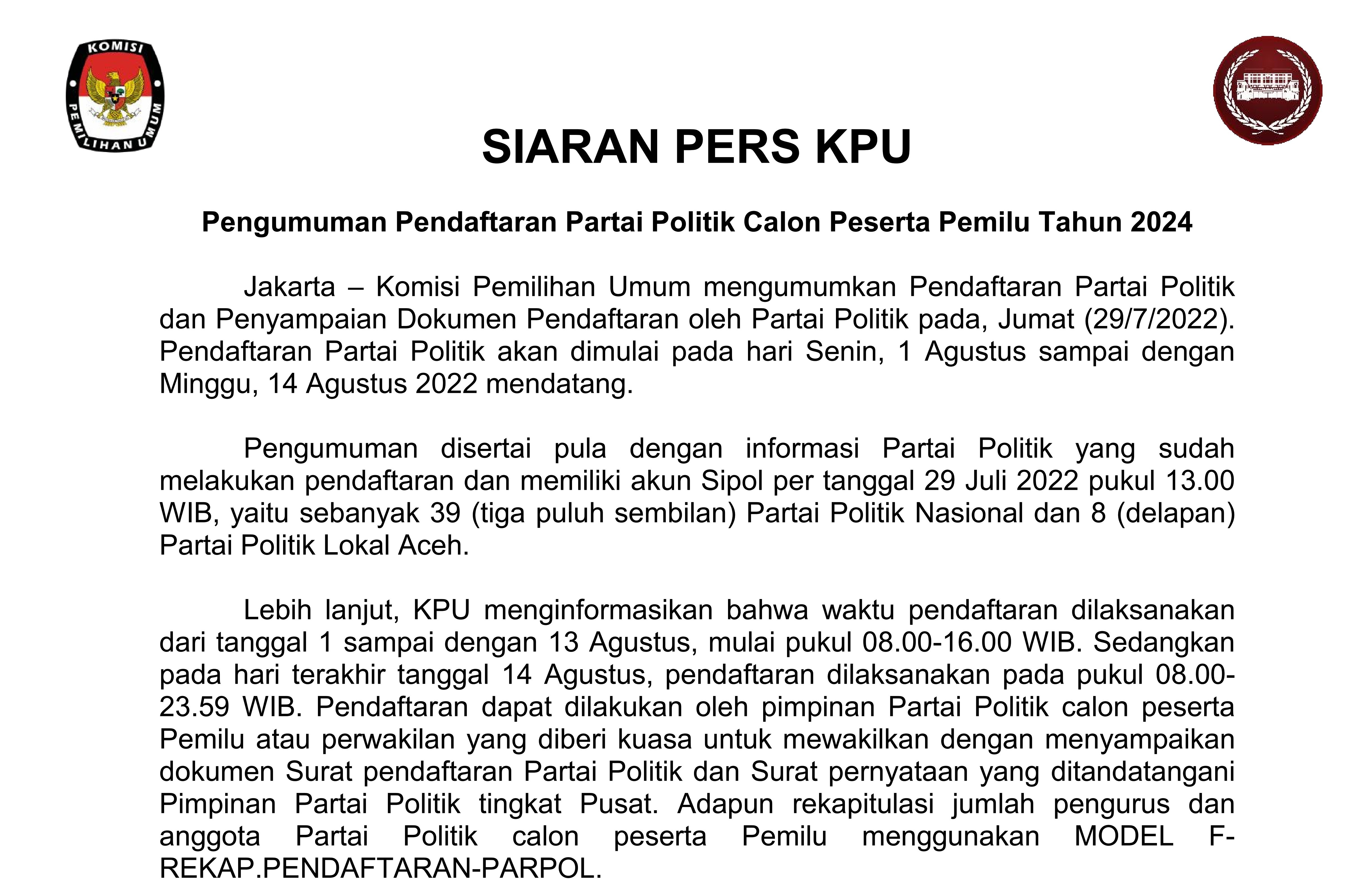 Jakarta – Komisi Pemilihan Umum mengumumkan Pendaftaran Partai Politik dan Penyampaian Dokumen Pendaftaran oleh Partai Politik pada, Jumat (29/7/2022). Pendaftaran Partai Politik akan dimulai pada hari Senin, 1 Agustus sampai dengan Minggu, 14 Agustus 2022 mendatang. Rilis selengkapnya dapat diunduh di sini
