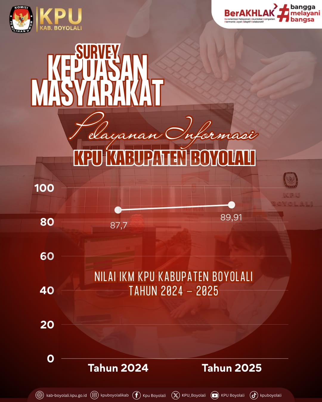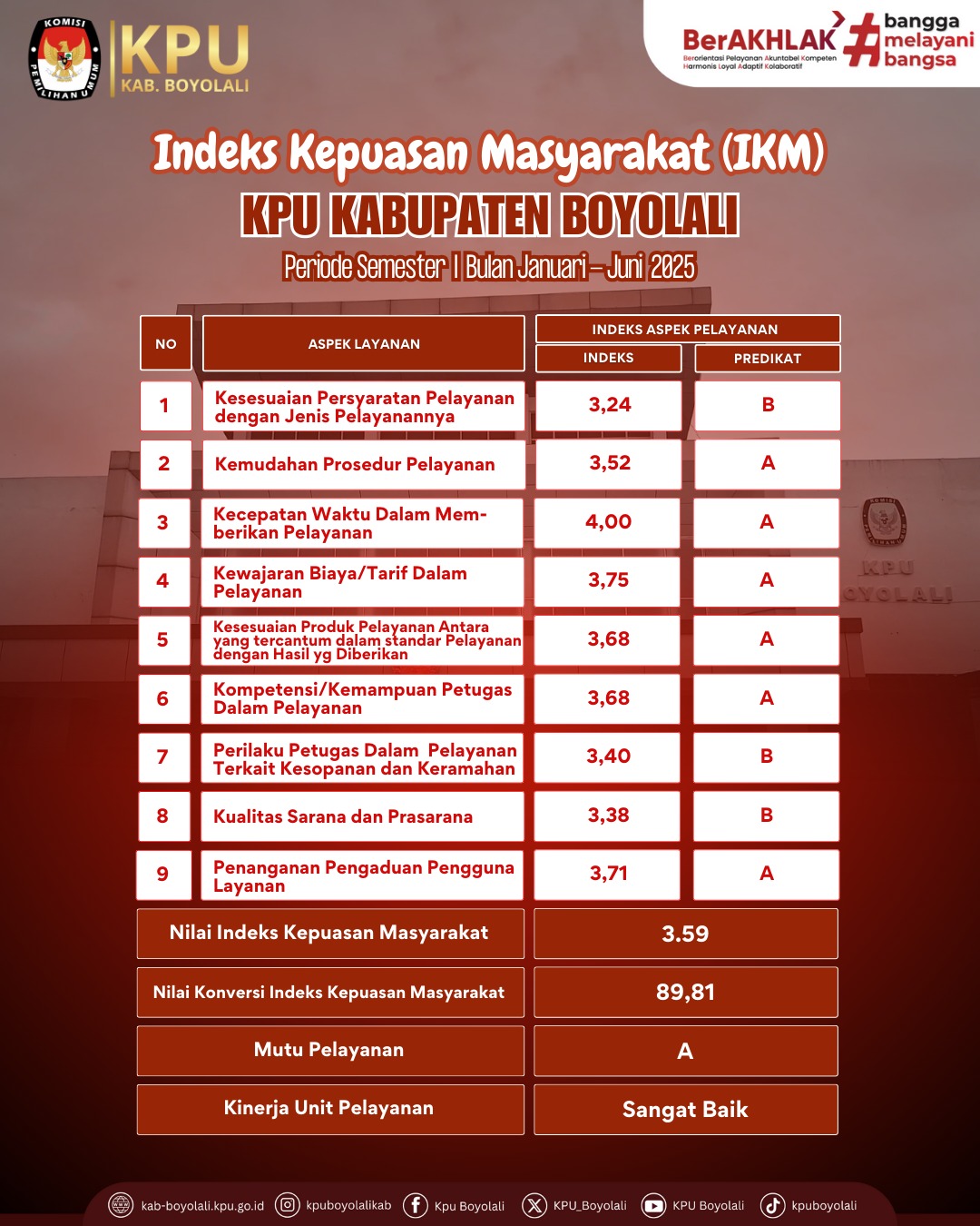 KPU Kabupaten Boyolali senantiasa berkomitmen memberikan pelayanan publik yang profesional, transparan, dan akuntabel. Sebagai bentuk evaluasi dan peningkatan kualitas layanan, telah dilakukan Penilaian Indeks Kepuasan Masyarakat (IKM) Semester I Tahun 2025 memperoleh nilai IKM sebesar 89,81. Capaian ini mengalami peningkatan dibandingkan dengan hasil Semester I Tahun 2024 yang sebesar 87,7.