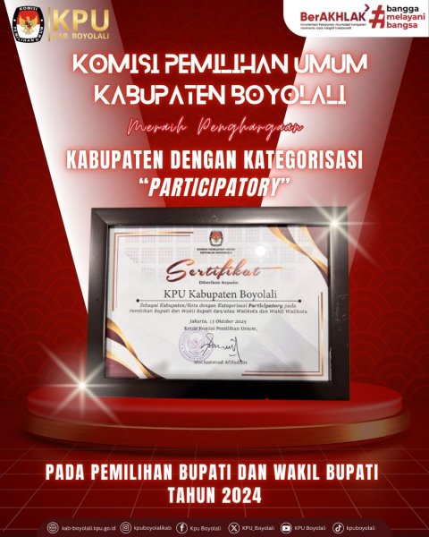 Boyolali, kab-boyolali.kpu.go.id – Komisi Pemilihan Umum (KPU) Kabupaten Boyolali menorehkan prestasi membanggakan di tingkat nasional. Dalam hasil pengukuran Indeks Partisipasi Pilkada (IPP) yang dirilis oleh KPU Republik Indonesia, KPU Kabupaten Boyolali berhasil meraih penghargaan dengan kategori Participatory pada pelaksanaan Pemilihan Bupati dan Wakil Bupati Boyolali Tahun 2024.