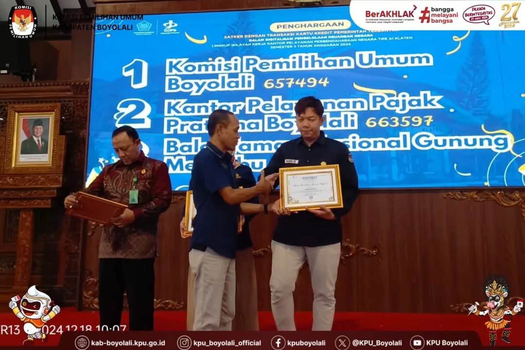 Boyolali, kab-boyolali.kpu.go.id - Komisi Pemilihan Umum (KPU) Kabupaten Boyolali meraih penghargaan Peringkat Pertama sebagai Satker dengan Transaksi Kartu Kredit Pemerintah Terbanyak dalam Digitalisasi Pengelolaan Keuangan Negara Lingkup Wilayah Kerja Kantor Pelayanan Perbendaharaan Negara Tipe A1 Klaten pada Semester II Tahun Anggaran 2024. Piagam penghargaan diterima langsung oleh Plt. Sekretaris KPU Kabupaten Boyolali, Sabbikisma Setia Nugraha, pada hari Rabu, 18 Desember 2024.