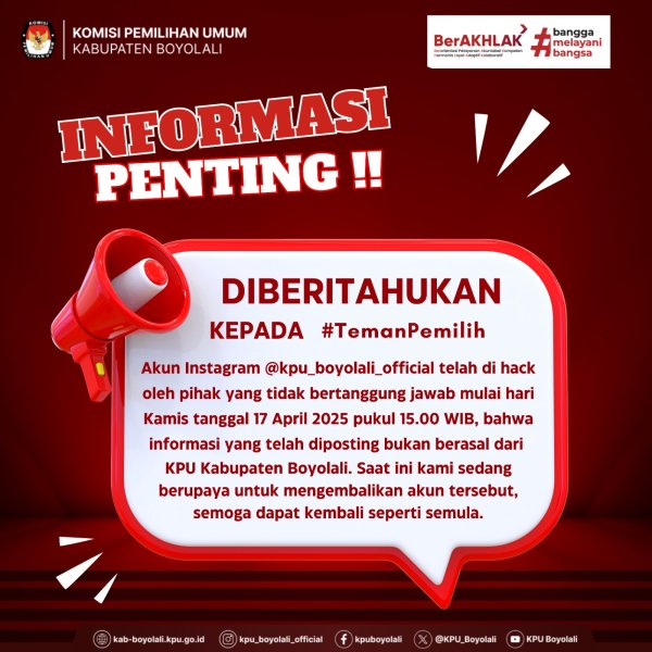 Ketua KPU Kabupaten Boyolali, Maya Yudayanti, didampingi Anggota KPU Kabupaten Boyolali dan pejabat struktural menyampaikan terima kasih dan apresiasi kepada pemerintah daerah Kabupaten Boyolali dalam penyelenggaraan Pilkada Serentak Tahun 2024. Kesuksesan dan kelancaran penyelenggaraan Pilkada Serentak Tahun 2024 tidak dapat tercapai tanpa dukungan dari semua pihak, salah satunya adalah Pemerintah Daerah Kabupaten Boyolali. Dalam kesempatan tersebut Ketua KPU Kabupaten Boyolali menyampaikan hal-hal terkait dengan penyelenggaraan Pilkada Serentak Tahun 2024, pengembalian sisa dana hibah Tahapan Pemilihan Bupati dan Wakil Bupati Boyolali Tahun 2024, permohonan anggaran non hibah serta kesiapan penyelenggaraan Pilkada Tahun 2030. Maya Yudayanti juga menyampaikan kegiatan KPU Kabupaten Boyolali pasca Pilkada serentak tahun 2024 usai, yaitu Pemutakhiran Data Pemilih Berkelanjutan dan Pendidikan Pemilih.