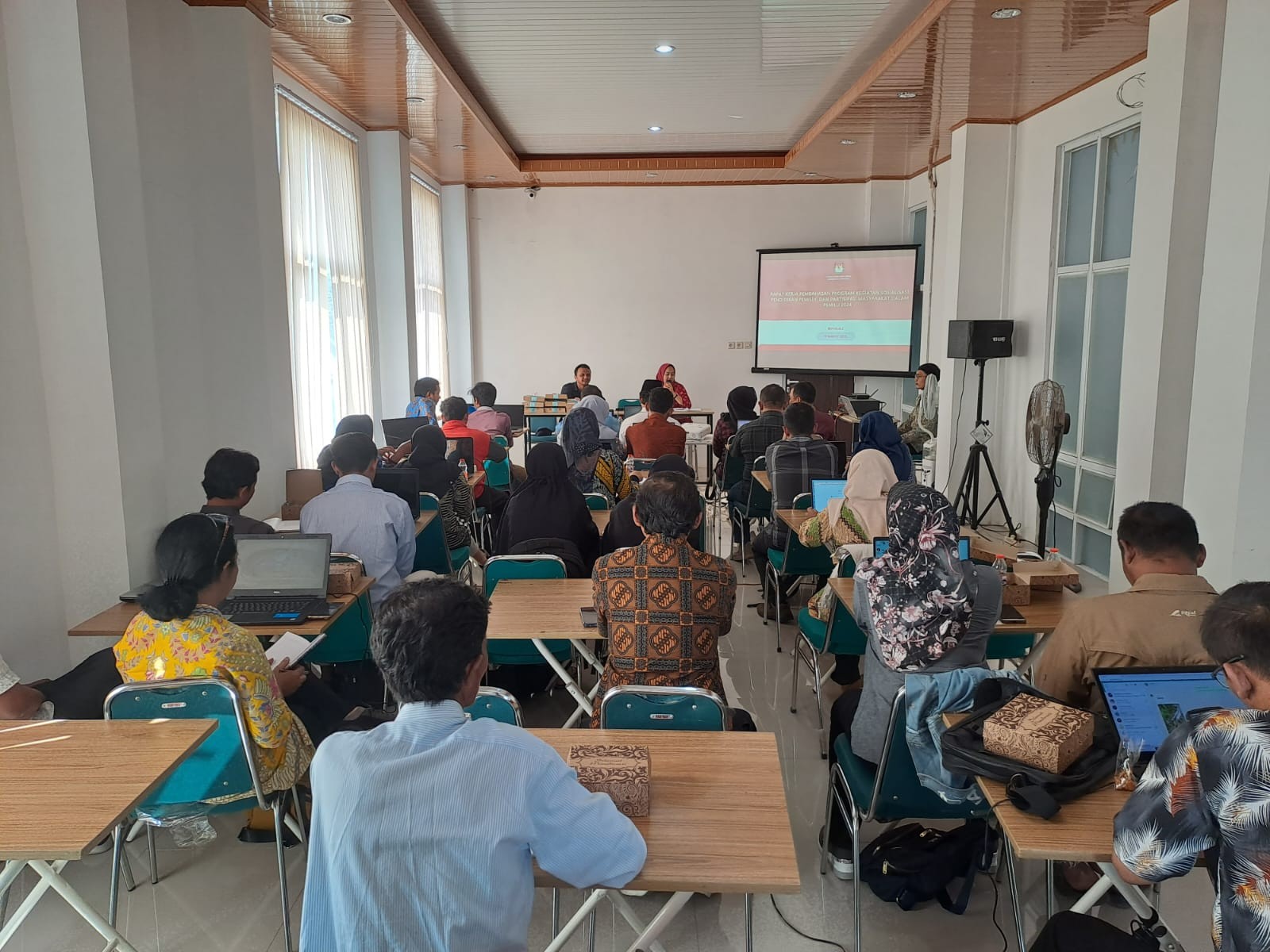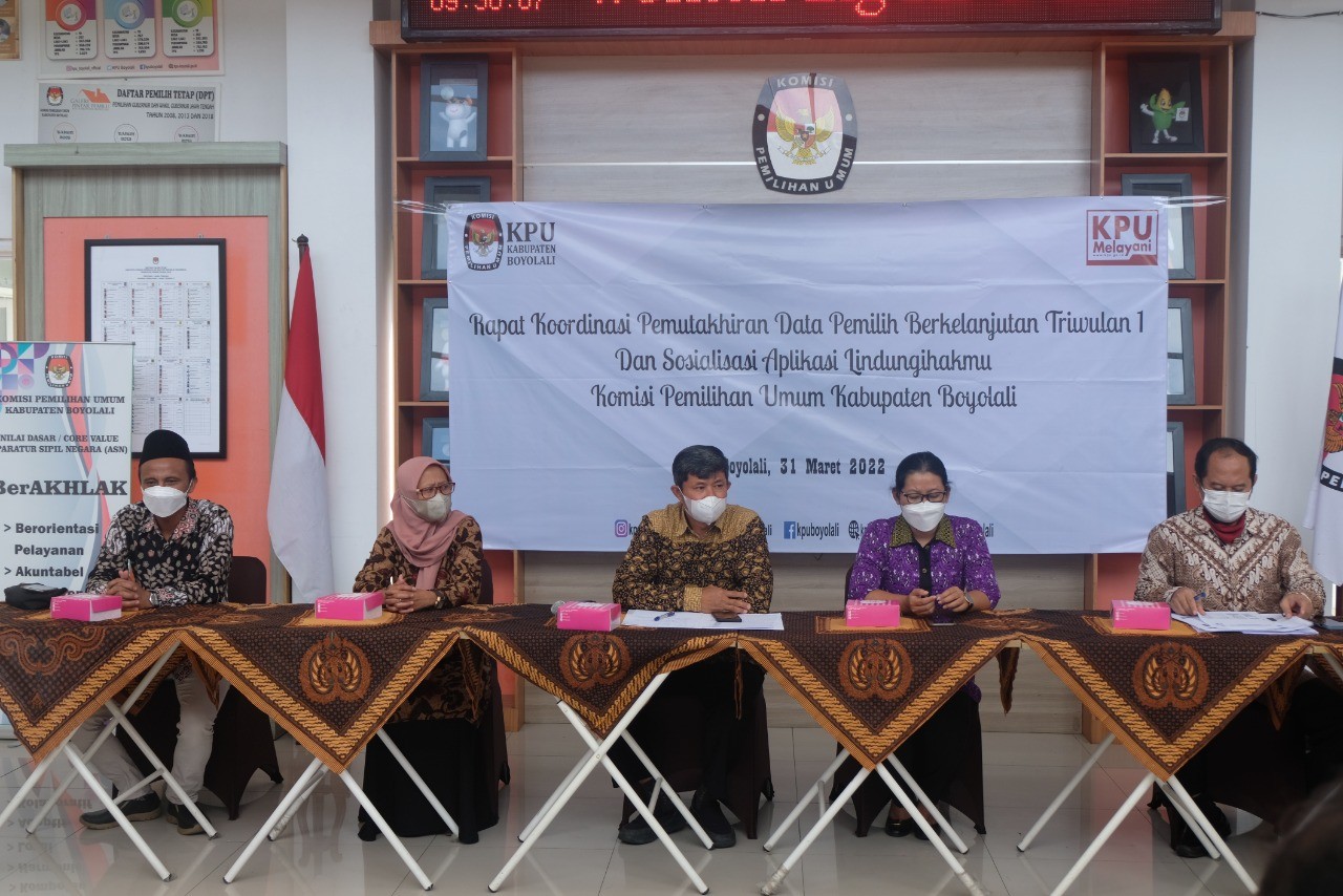 BOYOLALI - Komisi Pemilihan Umum Kabupaten Boyolali mengadakan Rapat Koordinasi Triwulan 1 dalam rangka Rekapitulasi Pemutakhiran Daftar Pemilih Berkelanjutan dengan jumlah sebanyak 816.422 (Delapan Ratus Enam Belas Ribu Empat Ratus Dua Puluh Dua) dengan rincian pemilih laki-laki berjumlah 404.633 (Empat Ratus Empat Ribu Enam Ratus Tiga Puluh Tiga) pemilih, dan pemilih perempuan berjumlah 411.789 (Empat Ratus Sebelas Ribu Tujuh Ratus Delapan Puluh Sembilan). Pemilih tersebar di 22 (dua puluh dua) Kecamatan. Potensi penambahan pemilih baru pada Maret 2022 berjumlah 2.075 sedangkan pemilih yang TMS berjumlah 1.160 selama Triwulan 1 bulan Januari-Maret 2022