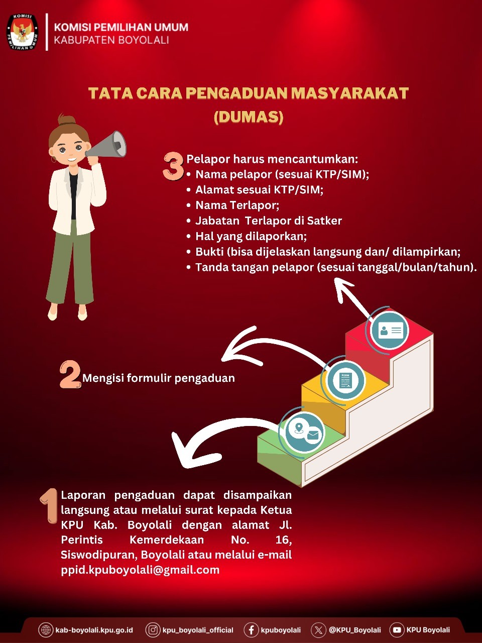 - Laporan pengaduan dapat disampaikan langsung atau melalui surat kepada Ketua KPU Kabupaten Boyolali dengan alamat Jl. Perintis Kemerdekaan No. 16, Siswodipuran, Boyolali atau melalui email ppid.kpuboyolali@gmail.com;